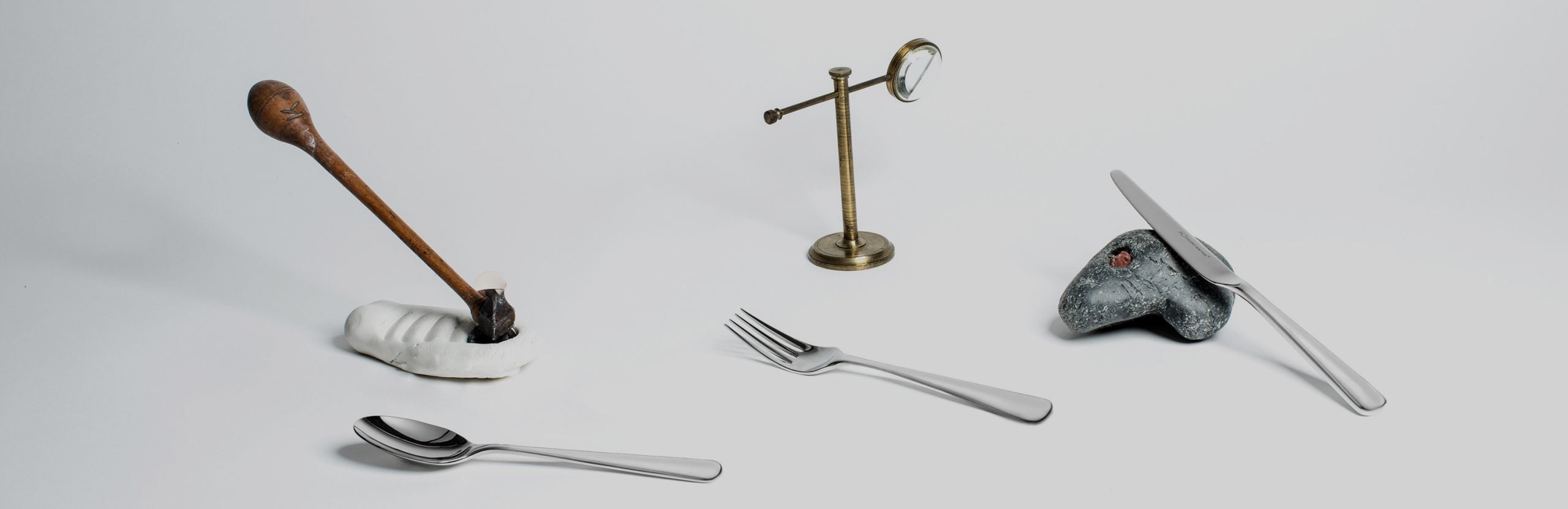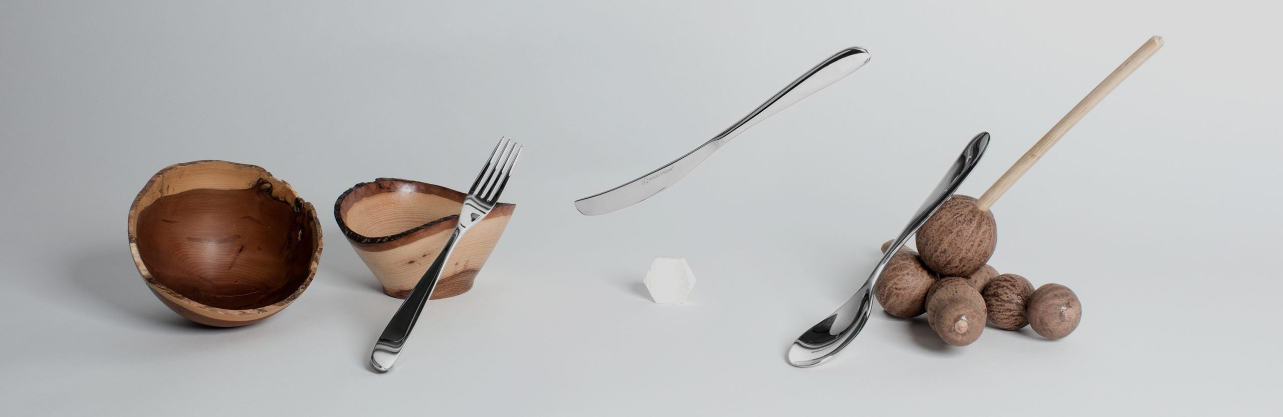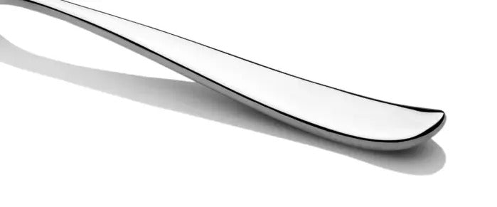 The knife handles have a gorgeous curve on the back of the handle, to fit into the palm of the hand, and feature a characteristic curved blade. The forks and spoons have a lovely kick-up at the bottom of each handle for comfort in the hand, while the spoon bowls are gently off-centre, adding to the natural feeling of the range.