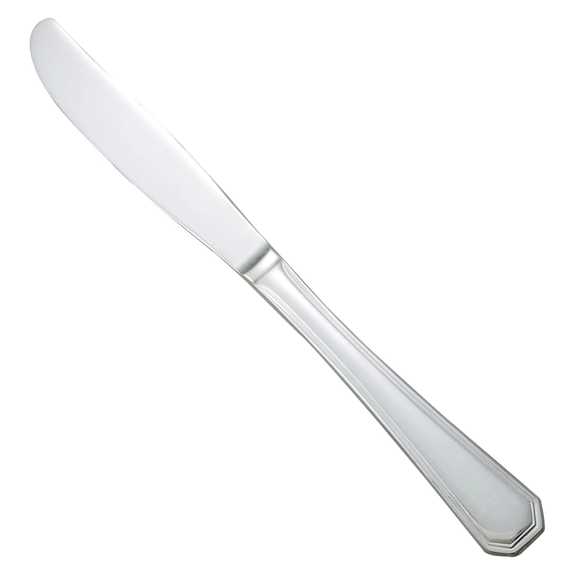 Create an elevated table setting with this commercial-grade 9.75" dinner knife, part of the Victoria flatware collection by Winco. This versatile dinner knife is ideal for main courses or as a general purpose table knife. The Victoria flatware collection features simple aristocratic lines making it an ideal choice for a formal setting. Forged from heavy-duty stainless steel, this heavyweight dinner knife is designed to withstand daily use in a commercial foodservice environment making it an ideal choice for hotels, cafes and restaurants. Each piece of the Victoria flatware collection is dishwasher safe for both residential and commercial dishwashers. The elegant mirror finish is designed to last and is resistant to pitting or dulling, even after repeated washes.
